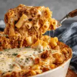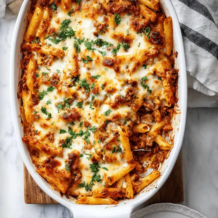 Baked Ziti is a classic Italian-American comfort dish made with pasta, rich meat sauce, creamy ricotta, and melted cheese baked until bubbly and golden. It is hearty, family-friendly, and perfect for make-ahead meals, gatherings, or weeknight dinners. The combination of beef, sausage, and tomato sauce creates a deep, savory flavor while the cheese layers add creaminess and richness.
