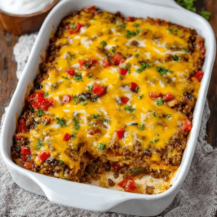 The Creamy Burrito Casserole is a quick, cheesy, and flavorful Tex-Mex meal that’s perfect for busy weeknights or family gatherings. With layers of seasoned beef, refried beans, creamy sauce, and melty cheese, it’s comfort food that everyone will love. Easy to make ahead, freezer-friendly, and endlessly customizable, this casserole is a go-to recipe for delicious, fuss-free dinners. Serve it with fresh lime, salsa, or guacamole for an extra burst of flavor, and watch it become a staple in your weekly meal rotation!