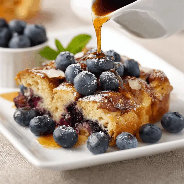 Serve this Blueberry French Toast Casserole warm, topped with maple syrup, powdered sugar, or a dollop of whipped cream for a sweet finishing touch. For an elegant touch, drizzle with homemade blueberry syrup or a light lemon glaze. Pair it with breakfast meats like bacon or sausage, or serve alongside scrambled eggs and fresh fruit for a balanced brunch. Store leftovers covered in the refrigerator for up to 3 days. To reheat, place portions in the microwave for 30–45 seconds or cover the entire dish with foil and warm in the oven at 325°F until heated through. This casserole also freezes well—store in an airtight container for up to 2 months. Thaw overnight in the refrigerator before reheating.