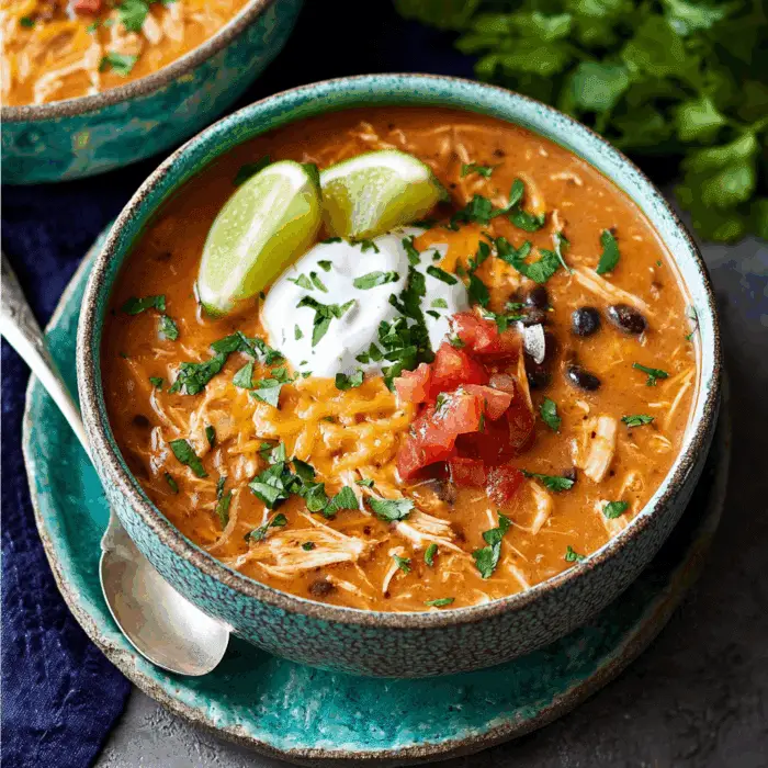 - Loaded Chicken Enchilada Soup – Top generously with avocado, sour cream, cilantro, crushed tortilla chips, and jalapeño slices for a “fully loaded” experience.