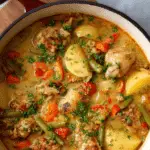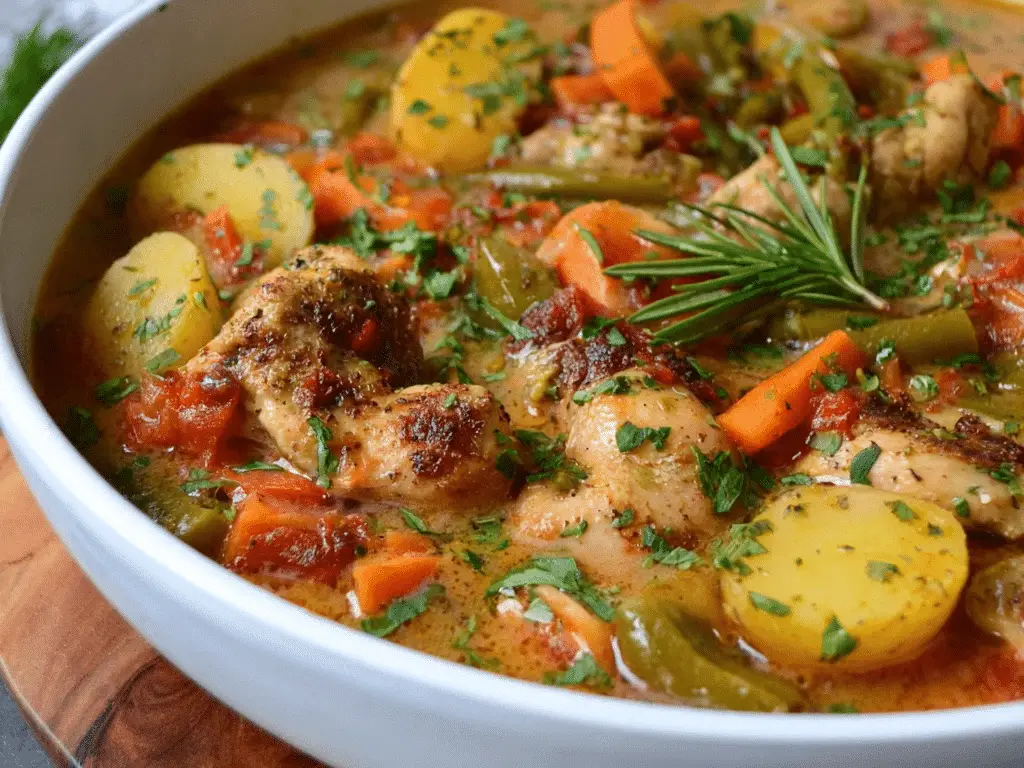 This hearty chicken stew is the definition of comfort in a bowl. Tender chicken, colorful vegetables, creamy broth, and simple seasonings come together in one satisfying dish. It’s easy enough for weeknights yet cozy enough for Sunday dinner.