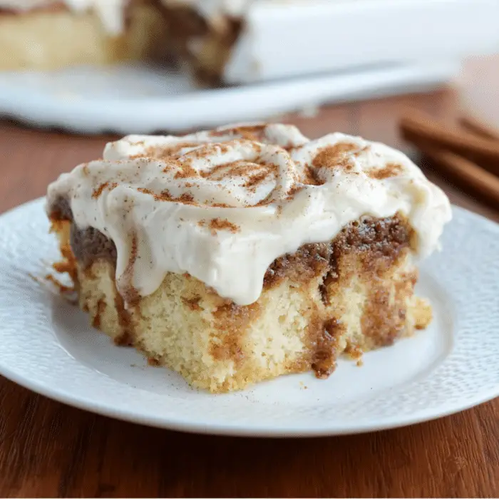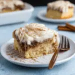 This soft white cake is baked, poked, and soaked with a rich cinnamon-butter sweetened condensed milk filling that seeps into every bite. It’s then topped with a smooth, creamy cream cheese frosting that tastes just like classic cinnamon roll icing.