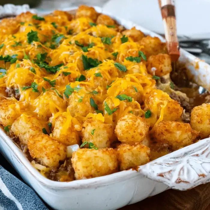 - Taco Style: Add 1 teaspoon chili powder and top with crushed tortilla chips instead of tater tots.