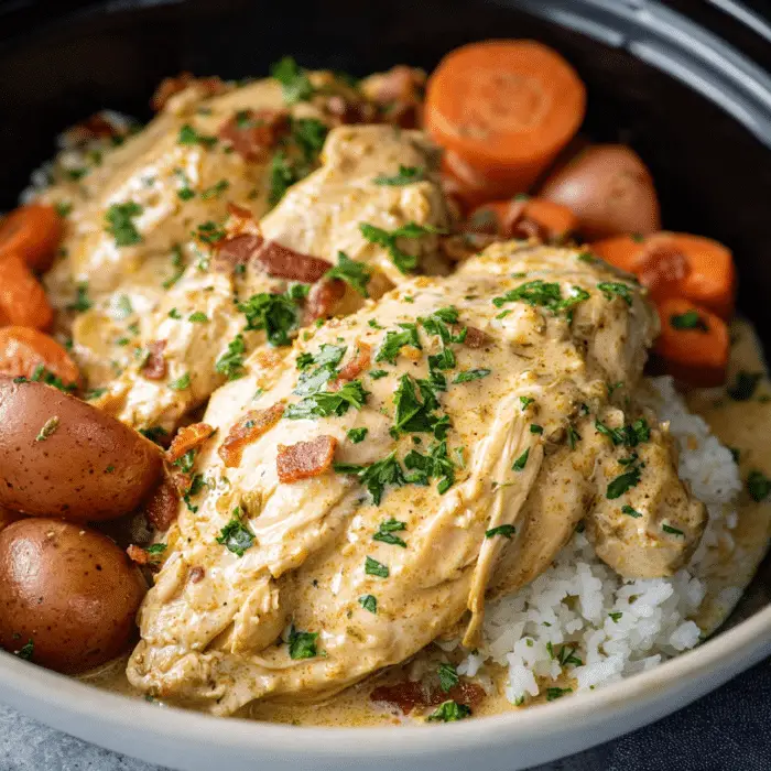 This Crockpot Creamy Ranch Chicken is ultra-creamy, packed with hearty chicken, potatoes, and carrots, all infused with bold ranch flavor. Perfect for busy weeknights or a comforting weekend dinner, this recipe is a family favorite. With minimal prep, your slow cooker does all the work, leaving you with tender, flavorful chicken in a rich, creamy sauce.