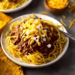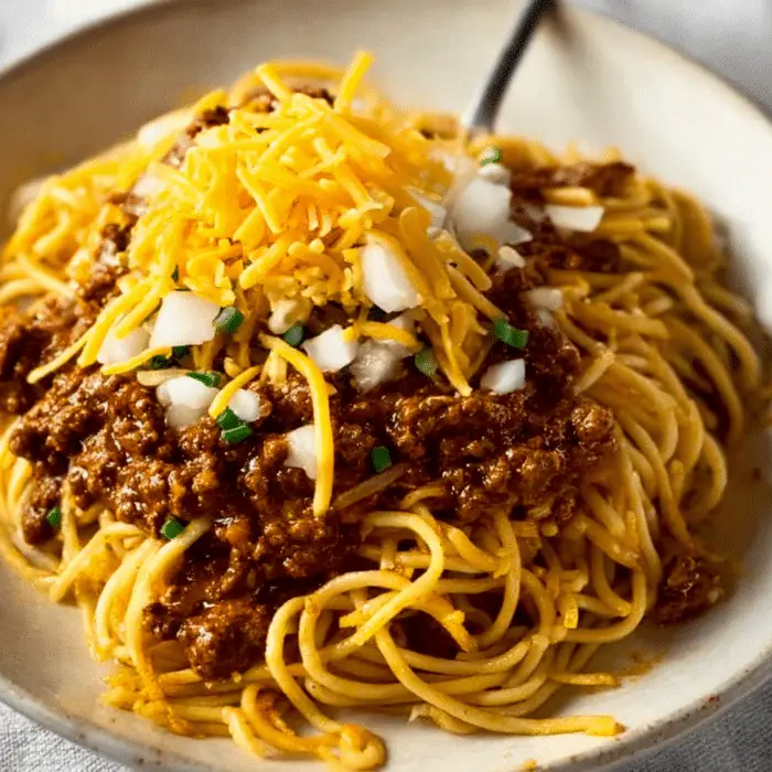 Serve Cincinnati Chili hot over freshly cooked spaghetti noodles for the classic presentation. You can also serve it over hot dogs for a traditional “Coney” style meal. Offer toppings like beans, diced onions, shredded cheddar cheese, and oyster crackers so everyone can customize their bowl. For the best flavor, allow the chili to chill overnight before serving because this resting time helps the spices fully develop. Store leftover chili in an airtight container in the refrigerator for up to 4 days. Reheat gently on the stove over medium heat, stirring occasionally. If the chili thickens too much, add a splash of water or broth while reheating. Cincinnati Chili also freezes well for up to 3 months. Let it cool completely before transferring to freezer-safe containers. Thaw overnight in the refrigerator before reheating.