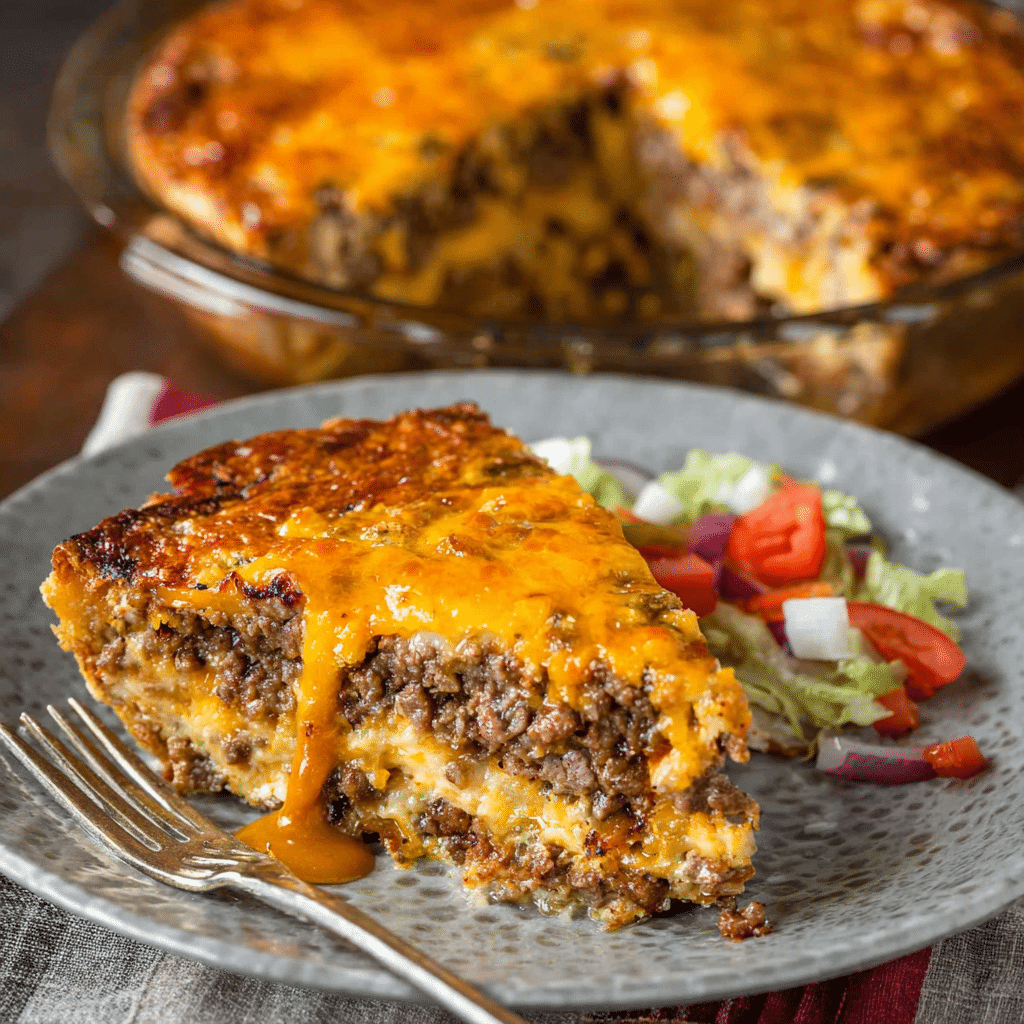- Cool and Serve: Allow the pie to cool for a few minutes before slicing and serving. Serve slices with your favorite toppings such as ketchup, mustard, pickles, or lettuce for a complete cheeseburger experience.
