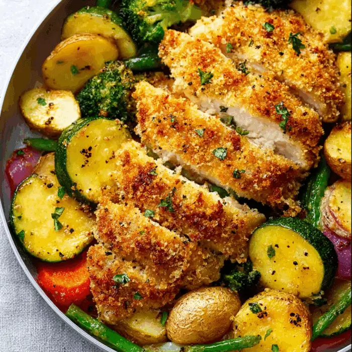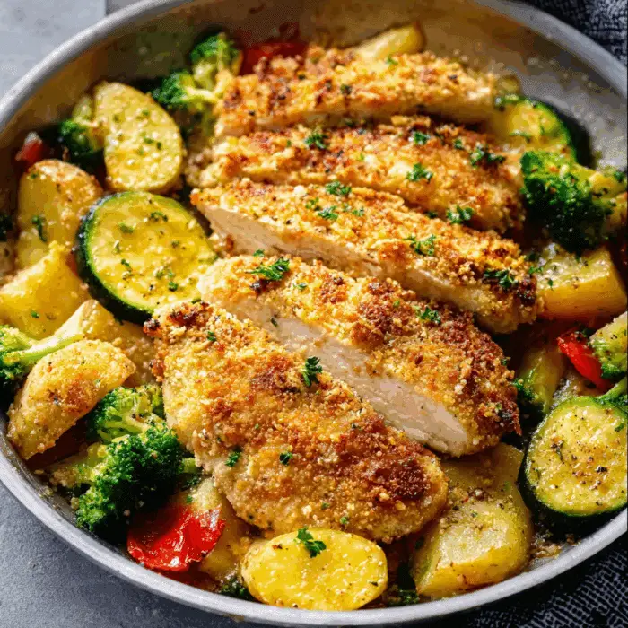 If you love easy, flavorful, and hearty dinners that come together in one pan, this One Pan Crispy Parmesan Garlic Chicken with Vegetables is a must-try. Juicy chicken breasts are coated in a buttery parmesan garlic crust and baked to golden perfection alongside tender zucchini, yellow squash, and baby red potatoes. This dish is everything you want in a weeknight dinner—simple, wholesome, and full of amazing flavor.
