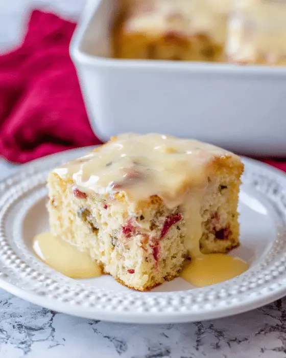 Rhubarb Cake with Butter Sauce is a classic old-fashioned dessert that highlights the perfect balance of sweet and tart flavors. This easy cake is baked in a 9 x 13 pan, making it ideal for potlucks, picnics, and family gatherings. Tender chunks of rhubarb bake into a soft, moist cake, while the warm butter sauce adds a rich and comforting finish that makes every bite irresistible.