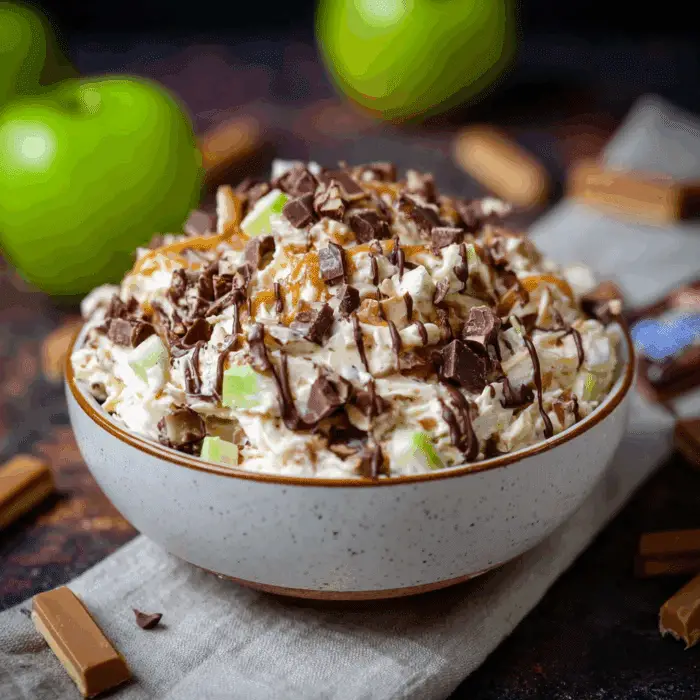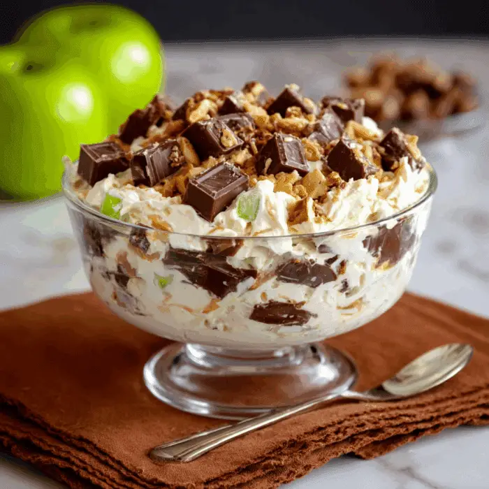 Snickers Salad is an easy, crowd-pleasing dessert that combines creamy pudding, whipped topping, fresh fruit, and Snickers candy bars. With just six ingredients and minimal prep time, it’s perfect for potlucks, parties, or casual gatherings. The combination of sweet candy, crisp apples, and juicy grapes creates a dessert that everyone will love.