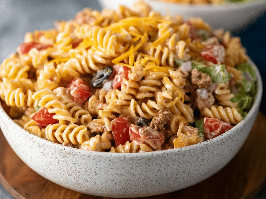 Taco Pasta Salad is a creamy, flavorful, and satisfying dish that combines classic taco flavors with tender pasta and fresh vegetables. It is perfect for meal prep, potlucks, family dinners, or gatherings because it can be made ahead and served cold. The creamy dressing, crunchy vegetables, and cheesy goodness make it a crowd-pleasing recipe that everyone enjoys.